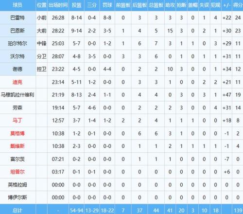 此役猛龙多达8人得分上双,2米06内线马穆凯拉什维利正负值更是高达无比夸张的+47。
