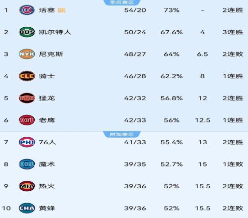 目前猛龙取得42胜32负战绩排名东部第五,只领先第七的费城(41-33)1个胜场;魔术以39胜35负位列东部第八,落后第六的老鹰(42-33)2.5个胜场。
