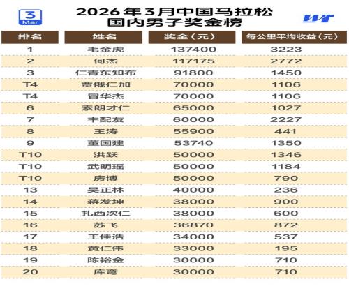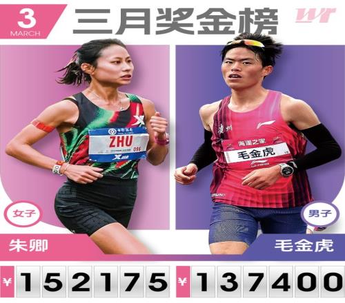 男子奖金王为毛金虎,以137400元登顶,他在无锡马拉松跑全马首秀跑出惊艳的2:07:36,斩获高额奖金,成为3月男子国内赛场最大赢家。