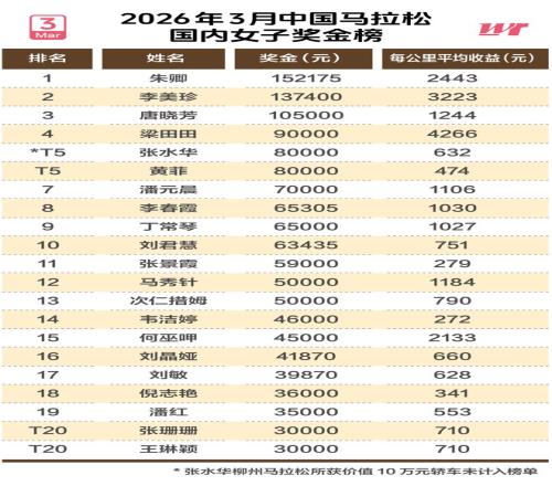3月马拉松奖金榜,折射出中国路跑的良性发展:赛事奖金持续上涨,本土选手不断PB,且收益提升,既让李美珍、梁田田、朱卿、毛金虎等顶尖选手获得匹配实力的回报,也给张水华、黄菲等大众精英提供生存空间。丰配友的百万破纪录奖励,同样也体现了行业对突破的重视。奖金不仅是选手的劳动回报,更成为激励他们冲击更好成绩、推动中国马拉松迈向世界水平的核心动力。■