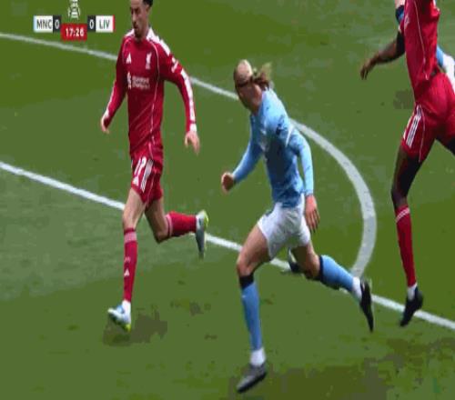 第38分钟,范戴克踢倒奥赖利送点,哈兰德点球破门,曼城1-0利物浦!