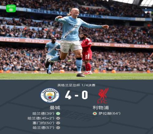 北京时间4月4日英格兰足总杯1/4决赛,曼城对阵利物浦。哈兰德帽子戏法,塞门约传射建功,萨拉赫丢点。最终比分曼城4-0利物浦晋级足总杯4强。